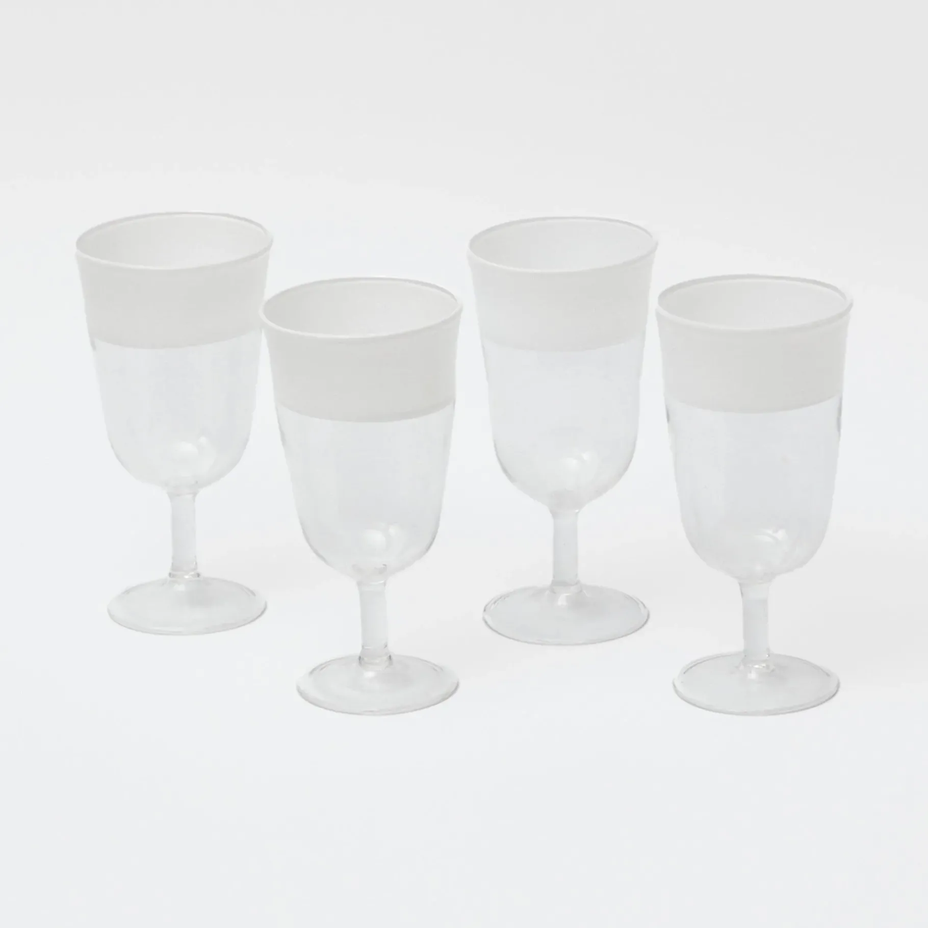 These Elegant Wine Glasses With Their White Ribboned Rims Are As Pretty As They Are Functional.Use Them Every Day In The Kitchen Or For A More Formal Dinner, We Love To Pair Them With Our Putty Ikat Tablecloth, Sylvie Green Linens & Grey Horn Cutlery.Set Includes:X4 White Ribbon Wine Glass (H 16Cm)Material: Glasscare Instructions: Hand Wash Only.