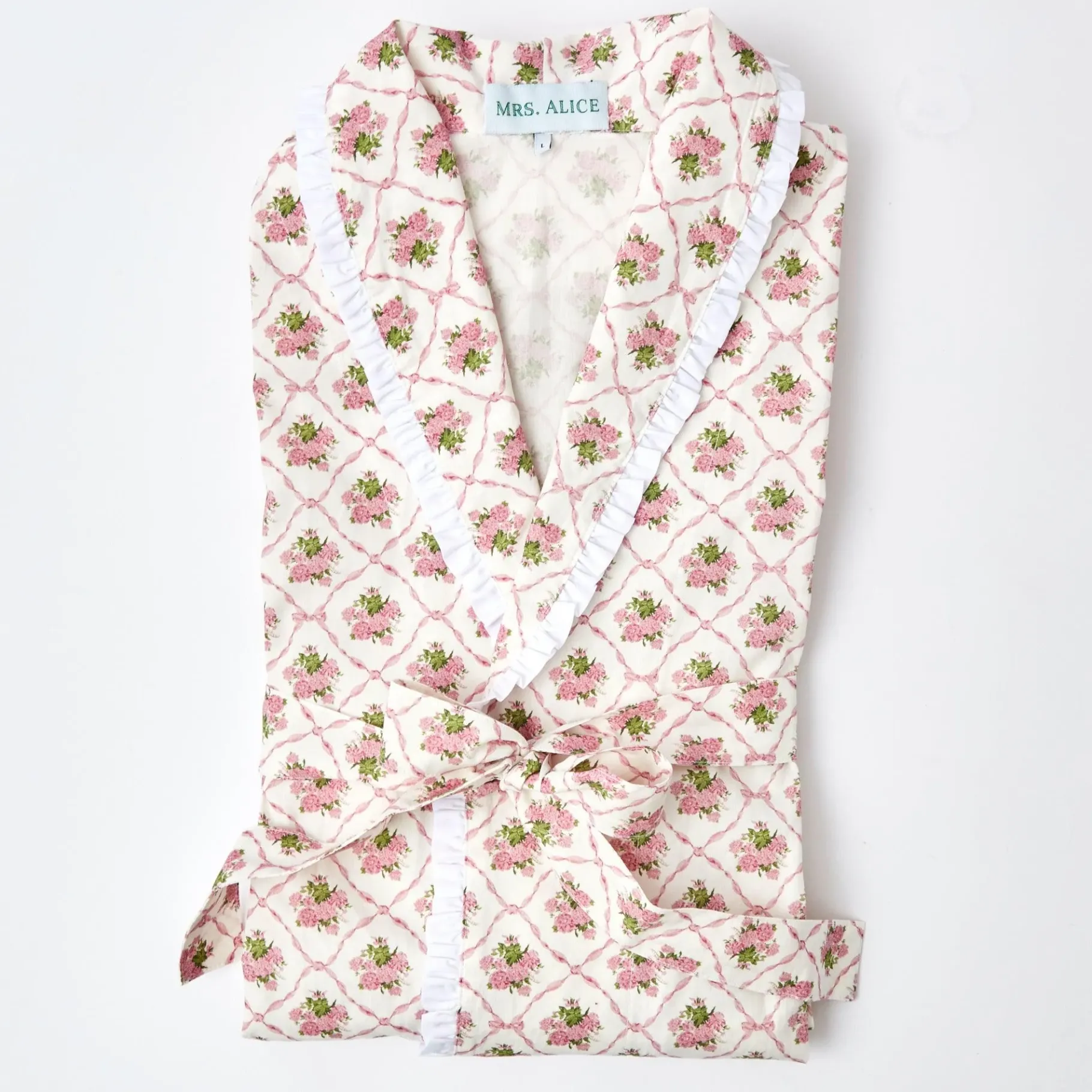 Designed In Our New Exclusive Alice’s Bouquet Print By Serena Fresson This Chic Blue And White Floral Dressing Gown Is Just Fabulous. With An Attractive Flower Garland Design Set Between A Trellis Of Ribbons And Bows, Inspiration For This Piece Came From A Vintage Robe That Serena Has Owned For Decades. Tied With A Sash At The Waist, This New Gown, Designed For A Comfortable Fit Comes In A Children’s Size Too, So All The Family Can Coordinate – Aka Going Matchy Matchy. Settle Into Bed Alongside Our Matching Pink Bouquet Cushion Or Serve Breakfast In Your Robe With Our Pink Bouquet Linen & Pink Bouquet Tablecloth. Sizes: Small/Medium Or Medium/Large Info: 100% Cotton. Designed For A Comfortable Fit. Unlined. Care Instructions: 40º Wash Tumble Dry Low Temperature Do Not Bleach Iron Medium Temperature Dry Cleaning (Serena Fresson For Mrs. Alice Copyright ©) To Personalise Your Dressing Gown (As Shown In The Final Image)