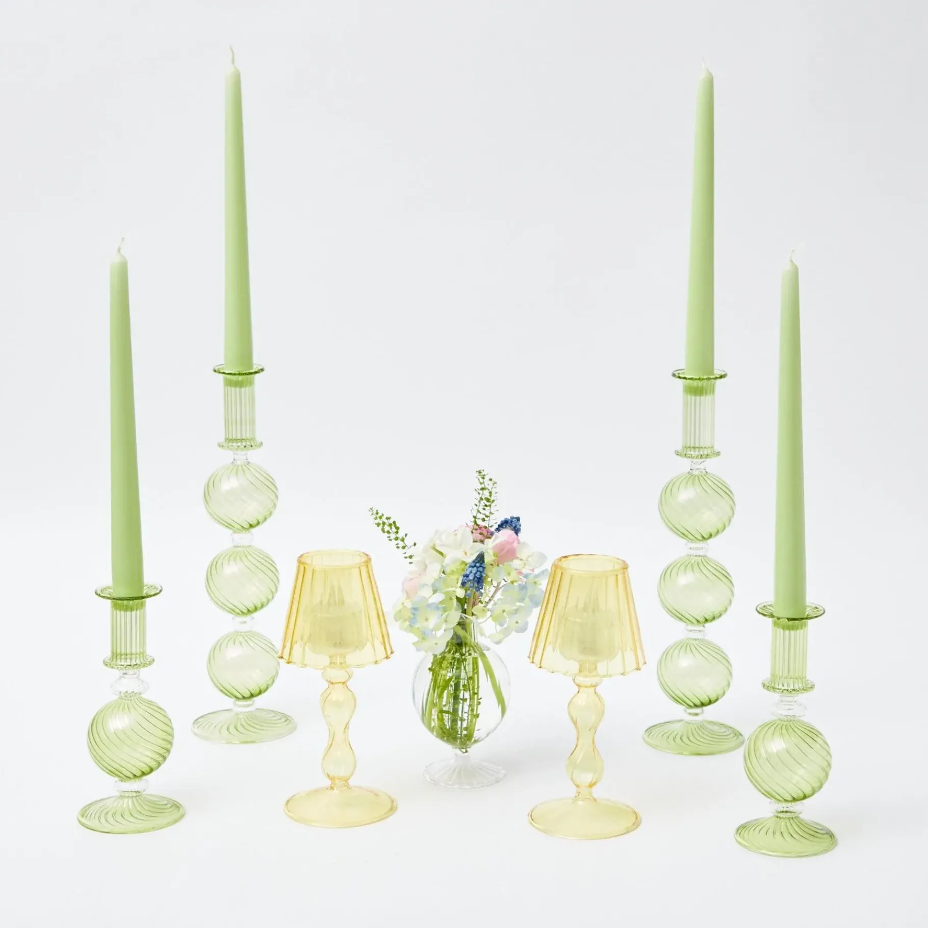Bring The Beauty Of Candlelight To Any Dining Or Kitchen Table With This Impressive And Elegant Candlescape.Featuring Our Large And Small Olive Camille Candle Holders, Green Candles Plus Our Beautiful Yellow Glass Lantern Tea Light Holder, This Set Will Also Work On A Mantlepiece.Pair Them With Our Joy Of Spring Decoration Set, Lola Tablecloth & Scalloped Easter Dinner Plates.Set Includes:X2 Olive Camille Candle Holders (H 30Cm X W 9Cm )X2 Small Olive Camille Candle Holders ( H 16Cm W 9Cm)X2 Yellow Glass Lantern Tea Light Holder ( H 18.5 Cm )X1 Box Of Spring Green Candles (8 Candles)Due To Their Charming Handblown Nature, The Candleholders Can Differ Slightly In Size And Shape.Care Instructions: Hand Wash Using Cold Water.