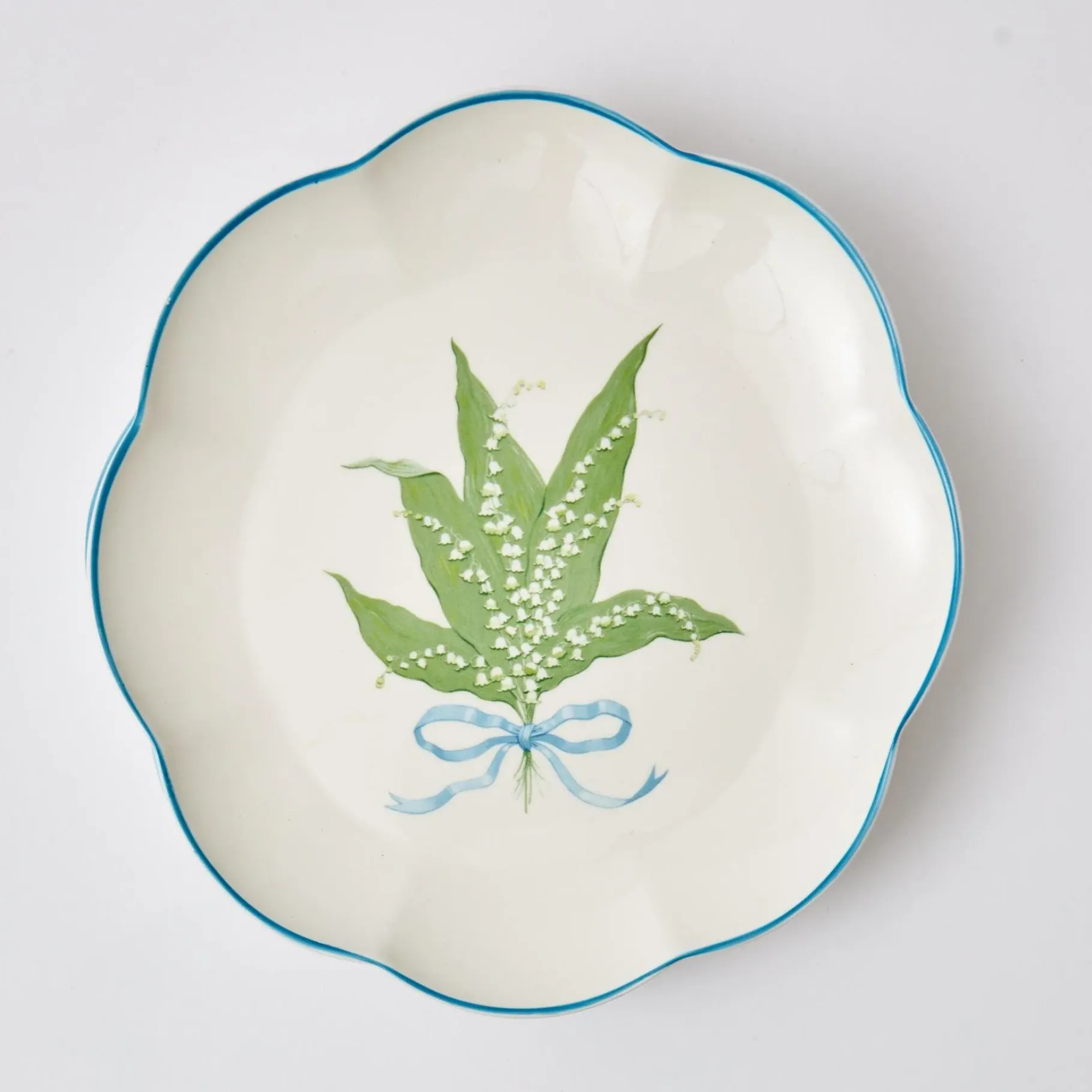 Alice’s Limited Edition Lily Of The Valley Side Plates Feature An Exclusive Design By Her Sister-In-Law And Artist Florence Houston.With Their Fine, Hand Painted Scalloped Blue Rim And Unique Watercolour Design They Were Made By Artisans In Stoke-On-Trent, The Home Of English Pottery.They Pair With The Lily Of The Valley Starter Plates, Blue Lacquer Placemats & Blue Bamboo Trellis Tablecloth.Size: 26 Cm Diameter