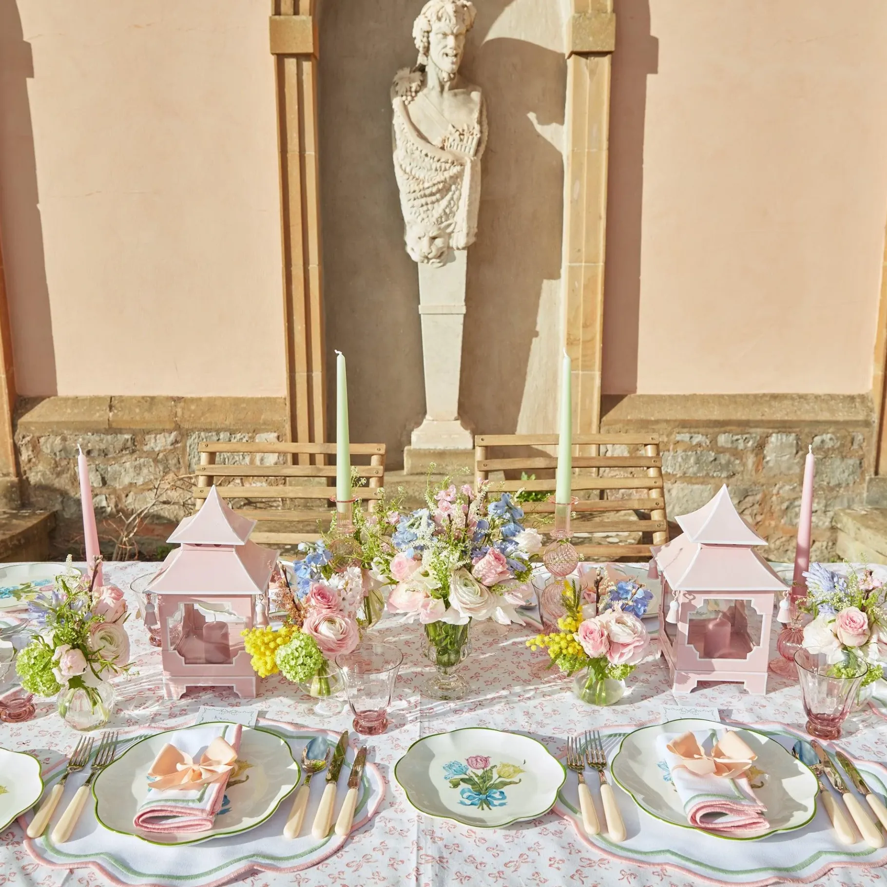 This Lovely Set Of Limited Edition Tulip Starter Plates Feature An Exclusive Illustration Designed By Founder Alice’s Mother Serena.Hand Painted And Finished In England, These Enticing Plates Feature A Scalloped Rim In Green And An Attractive Ribboned Tulip Design.Lay Them On Our Lilah Duck Egg Blue Linen, Blue Bow Tablecloth & Florence Pink Linen.Size: 21Cm