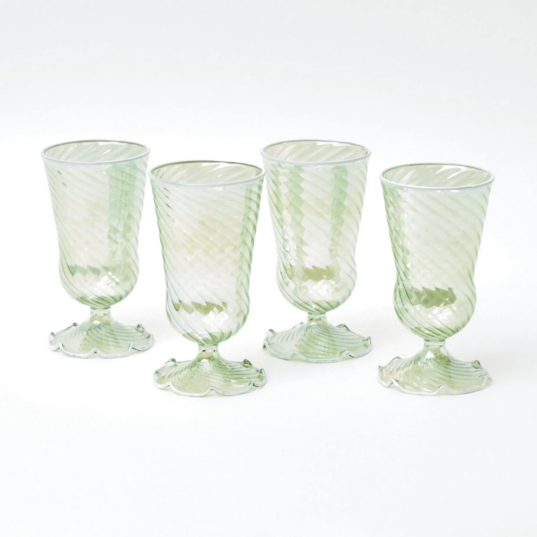 These Pretty Green Short Stem Wine Glasses Are Hand Blown With Swirling Fluted Sides And Feature Frilled, White-Tipped Bases And Rims. They Perfectly Match Our Willow Tablecloth, Alathea Green/Blue Placemats & Napkins Plus Our Capri Lettuce Dinner Plate.Size: 17Cm High X 7Cm Widedue To Their Charming Handblown Nature, The Glasses Can Differ Slightly In Size, Shape And Colour.Hand Wash Only.