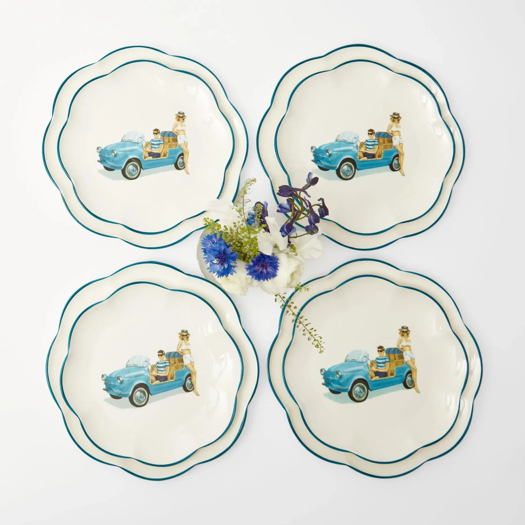 Our Charming Fiat Jolly Dinner & Starter Plates Are The Perfect Accompaniment To Your Al Fresco Dining. With A Hand-Painted Blue Scalloped Rim, These Summery Plates Feature A Handsome Couple Out With Their Iconic Fiat 500.Set Includes:X4 Fiat Jolly Starter Plates(23 Cm Diameter)X4 Fiat Jolly Dinner Plates (25 Cm Diameter)Care Instructions: Dishwasher Safe