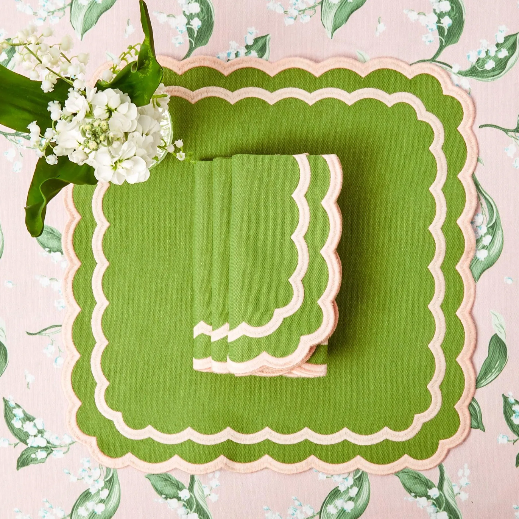 A Special Set Of Green Scalloped Placemats & Napkins With A Double Embroidered Edge In Pretty Pink.One Set Includes:X 4 Isla Green & Pink Placemats (45Cm Wide X 36Cm High)X 4 Isla Green & Pink Napkins (40Cm Wide X 40Cm High)Product Info: 100% Cotton, Water Resistant.Care Instructions: Machine Wash On A Cold Cycle Or Hand Wash And Leave To Air Dry.We Offer The Option To Personally Bespoke Your Napkins With Our Mrs. Alice Monogram Service. If You Would Like To Opt For This, Please Enter Up To 2 Initials In The Box Provided. Please Allow An Extra 2-5 Days From The Time Of Your Order For Monogramming.For Bespoke Quantity Of Placemats And Napkins Please Email [email protected].
