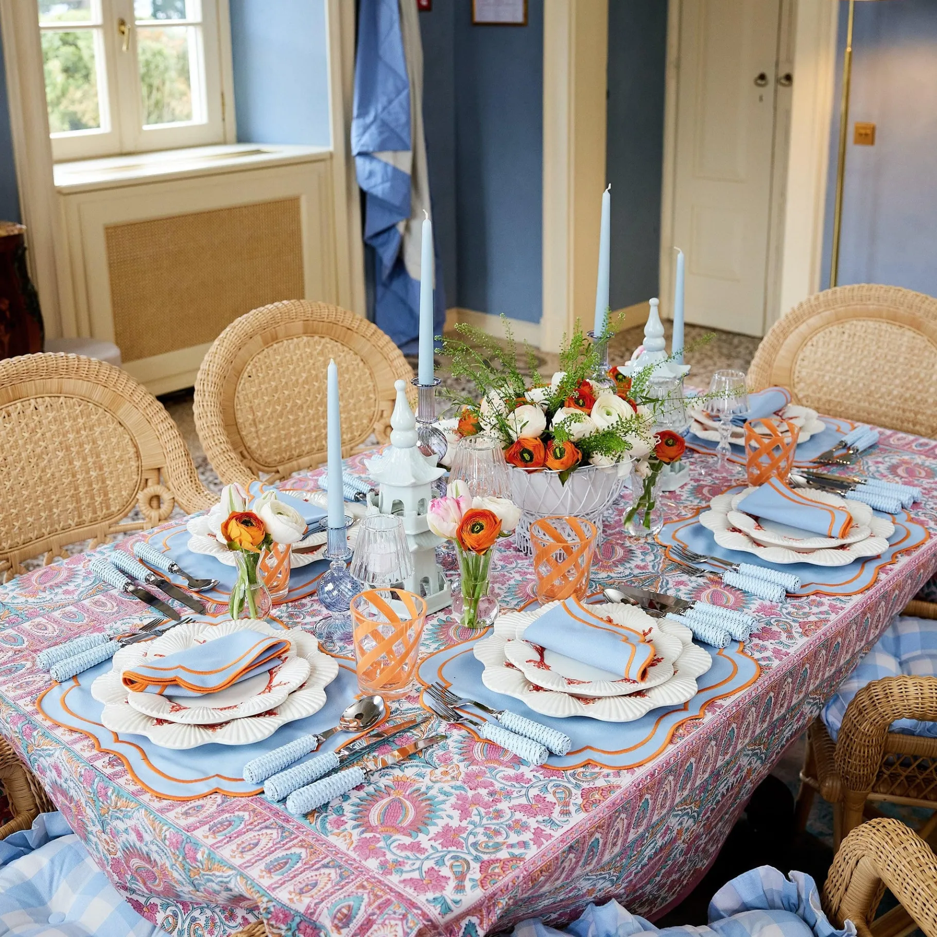 These Enchanting Sylvie Blue Placemats & Napkins Have An Orange Double Embroidered Edge In An Elegant Arabesque Style.This Table Was Shot In The Passalacqua’s Magnificent Baroque Dining Room On Lake Como, Italy.One Set Includes:X4 Sylvie Blue & Orange Napkins (38Cm X 38Cm)X4 Sylvie Blue & Orange Placemats (48Cm X 38Cm)We Offer The Option To Personally Bespoke Your Napkins With Our Mrs. Alice Monogram Service. If You Would Like To Opt For This, Please Enter Up To 2 Initials In The Box Provided. Please Allow An Extra 7-10 Days From The Time Of Your Order For Monogramming.Care Instructions: Machine Wash Cold. Do Not Tumble Dry.